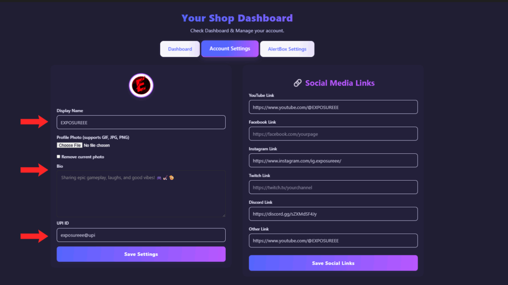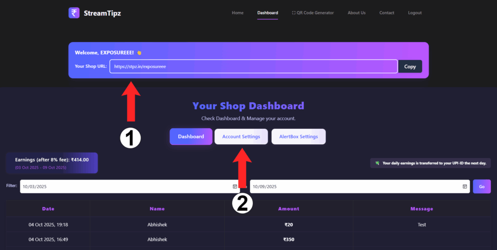 In your shop dashboard, go to “Account Settings.” Enter your UPI ID (e.g., yourid@upi). StreamTipz automates your earnings, so the total amount of tips received in a day is settled automatically to your UPI ID every day—no manual withdrawal required! This is what sets Stream Tips apart from other platforms.