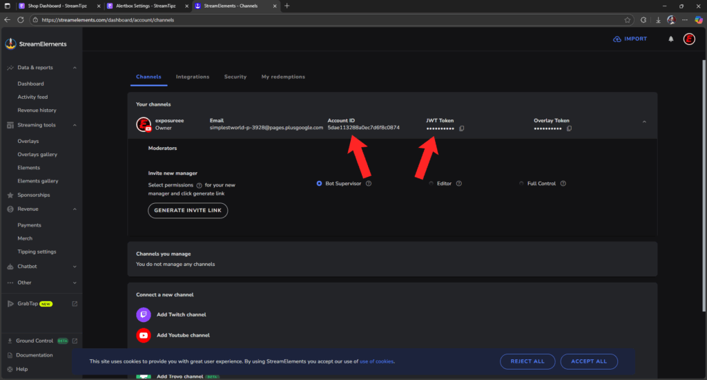 - Get your Channel ID and JWT Token from your StreamElements dashboard